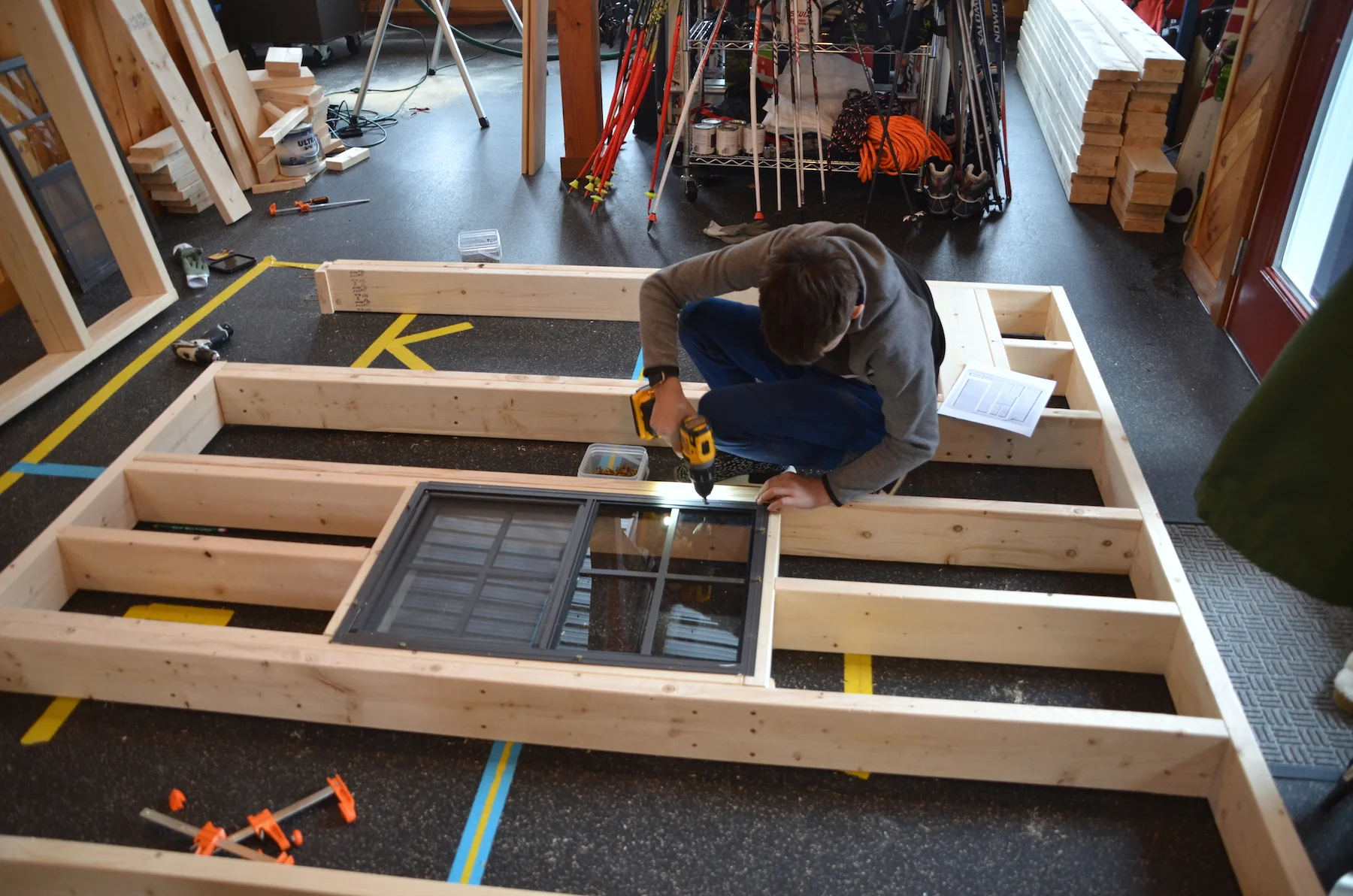 In our first session we reviewed our plans and created a cut-list for the front and rear walls of the structure. Alex measured and marked each 2x6 board and used the miter saw to cut them to length. Once the boards were prepped, we proceeded to assemble the frames. By the end of the day we finished both walls and test fit the front window.