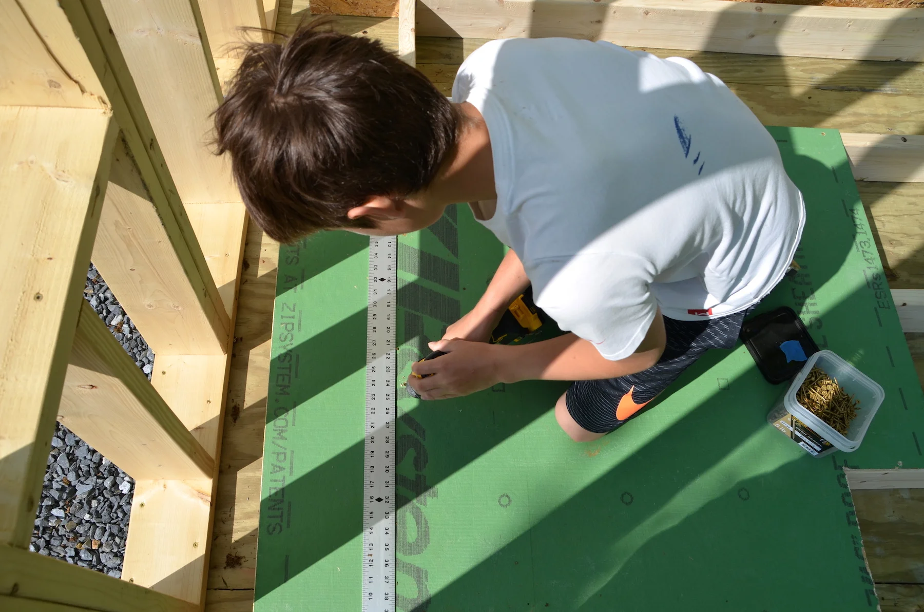 In our third session we finished framing our last wall and started cutting sheathing. We used Zip System sheathing which has a protective coating that is designed to help keep moisture out of the structure. Alex learned how to use the circular saw while cutting out a 16"x8' chunk out of a panel.