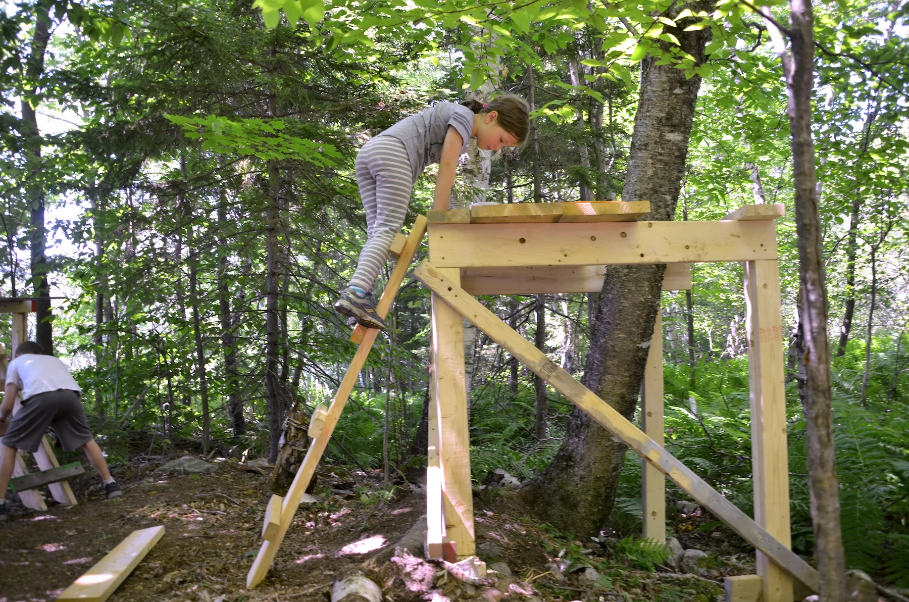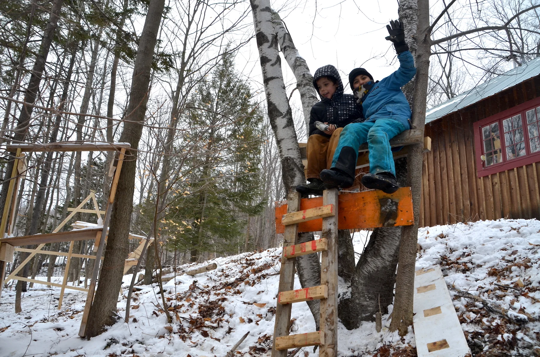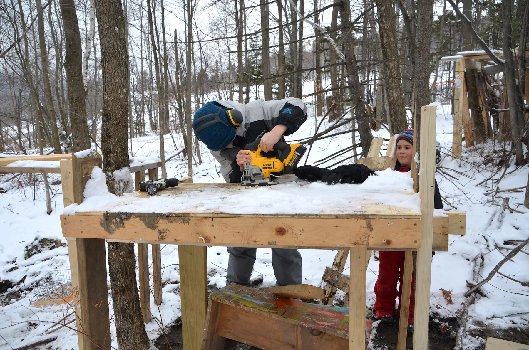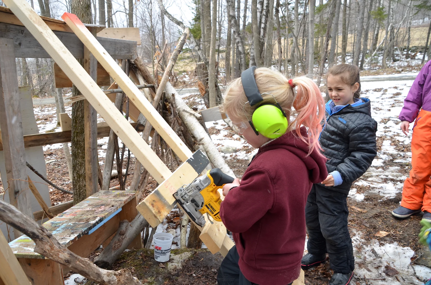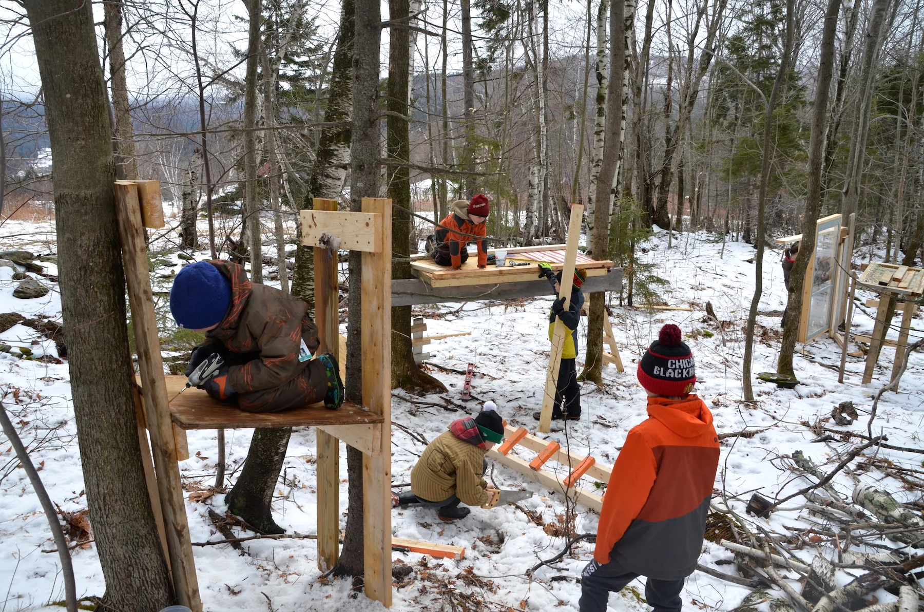 The Sculpture School take on the adventure playground concept is set within the woods surrounding our shop at Knoll Farm in Fayston, VT. Kids have access to drills, screws, clamps, scrap wood, and jigsaws. They use these tools and materials to construct in a natural landscape, adding on, taking down and evolving the village of forts through the seasons.
