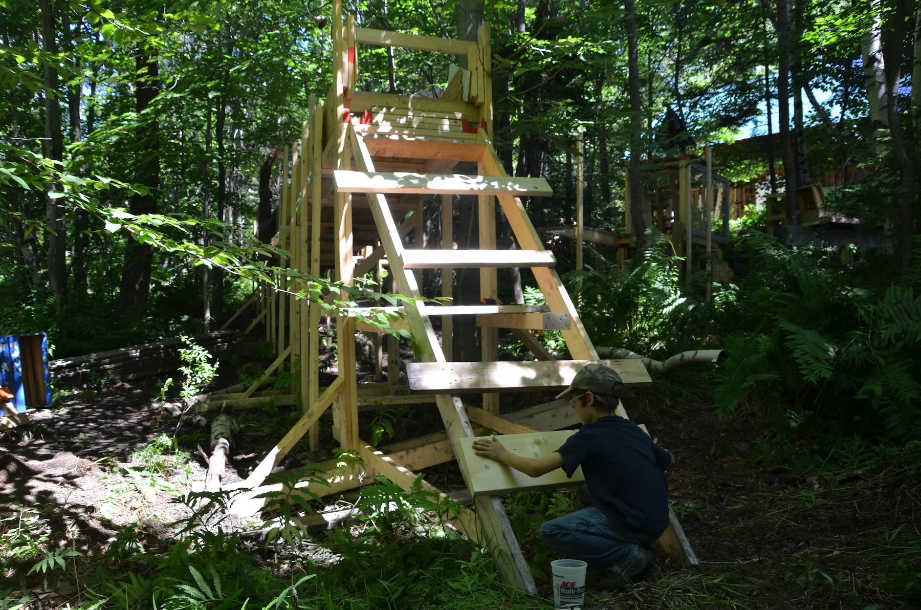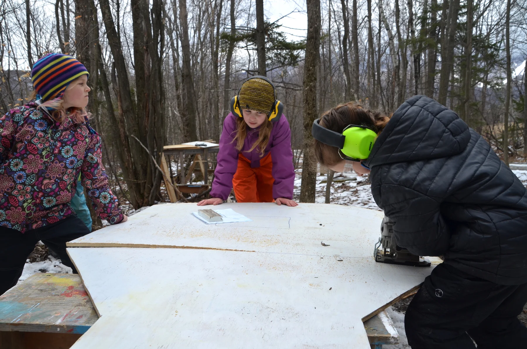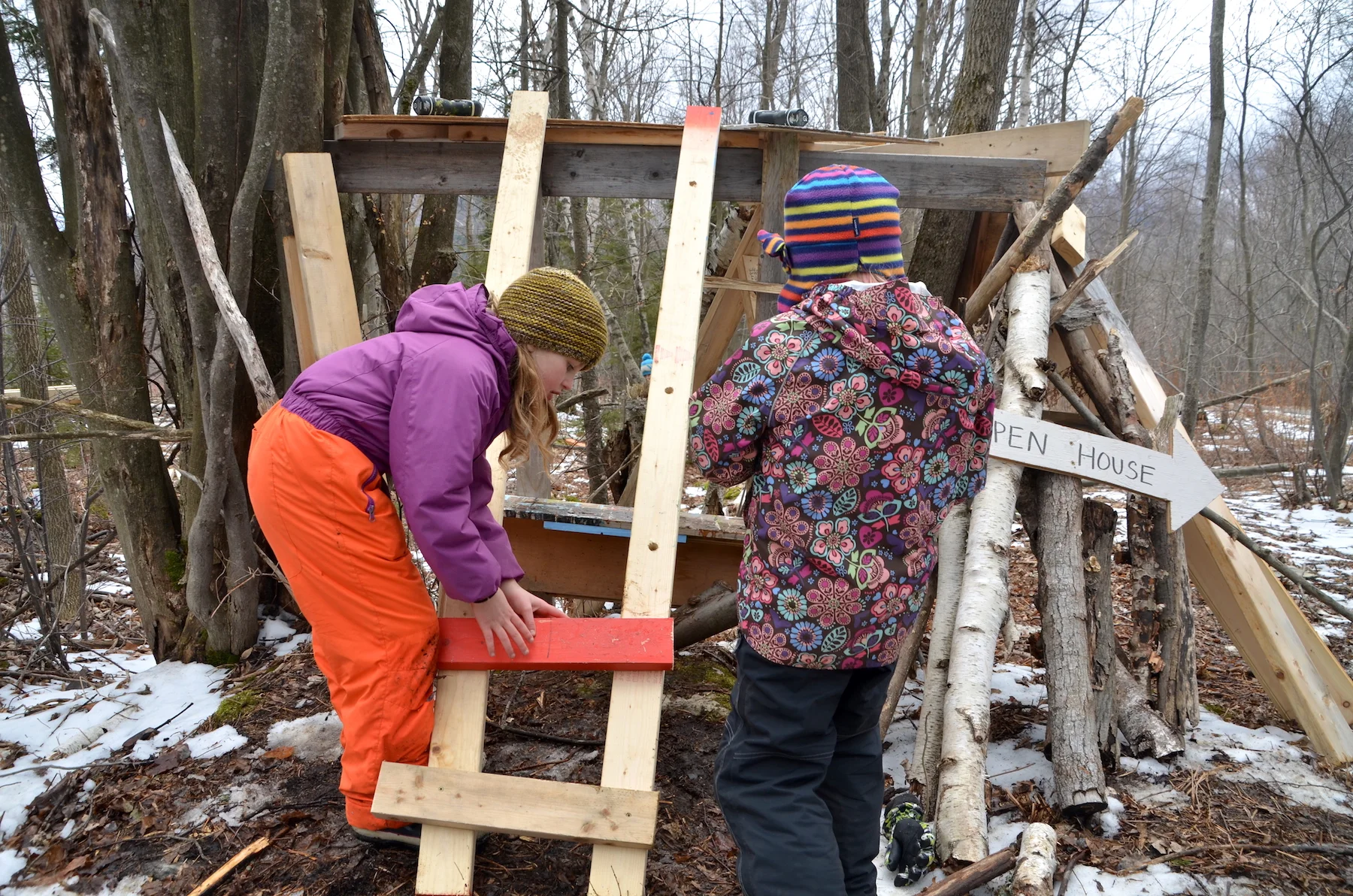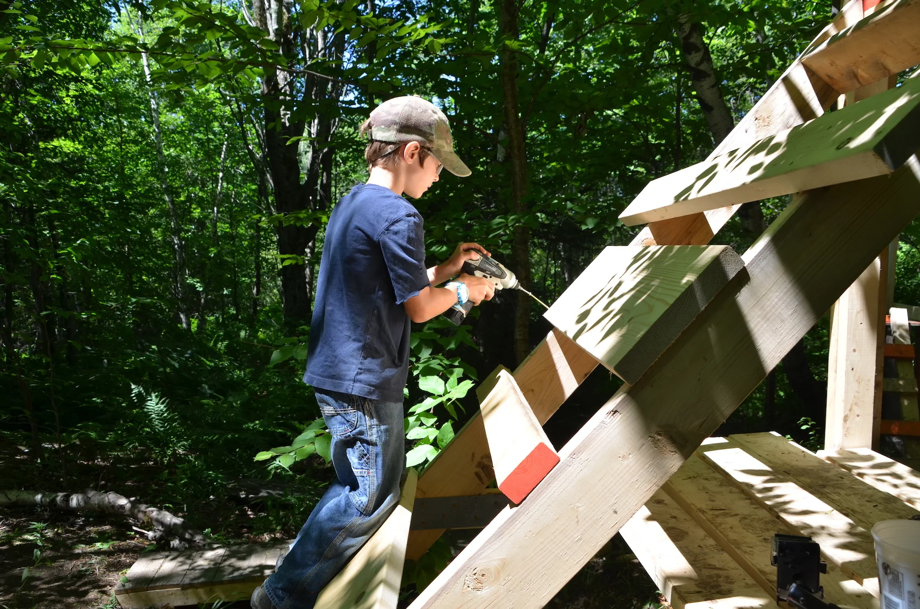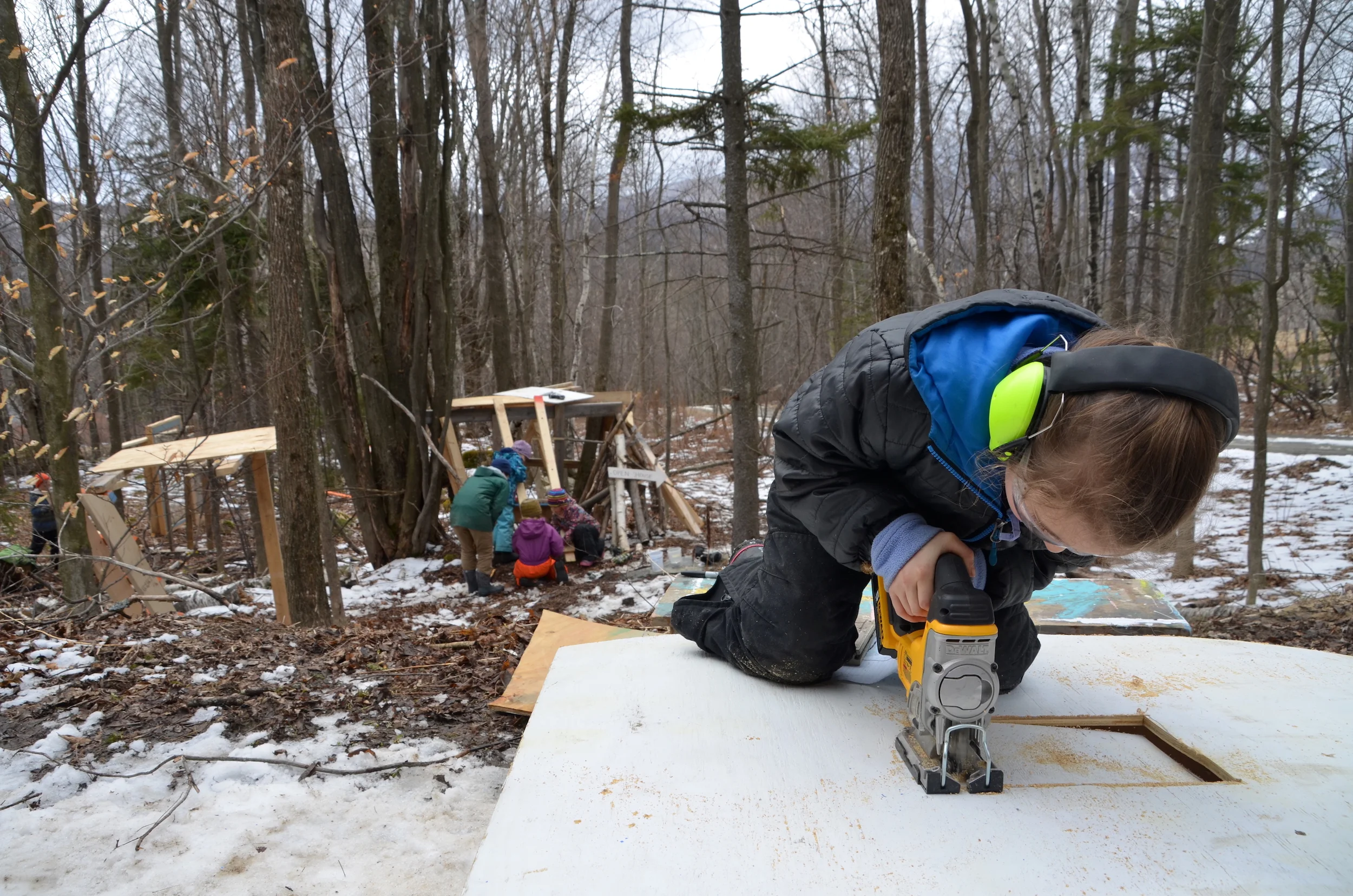 The Sculpture School take on the adventure playground concept is set within the woods surrounding our shop at Knoll Farm in Fayston, VT. Kids have access to drills, screws, clamps, scrap wood, and jigsaws. They use these tools and materials to construct in a natural landscape, adding on, taking down and evolving the village of forts through the seasons.
