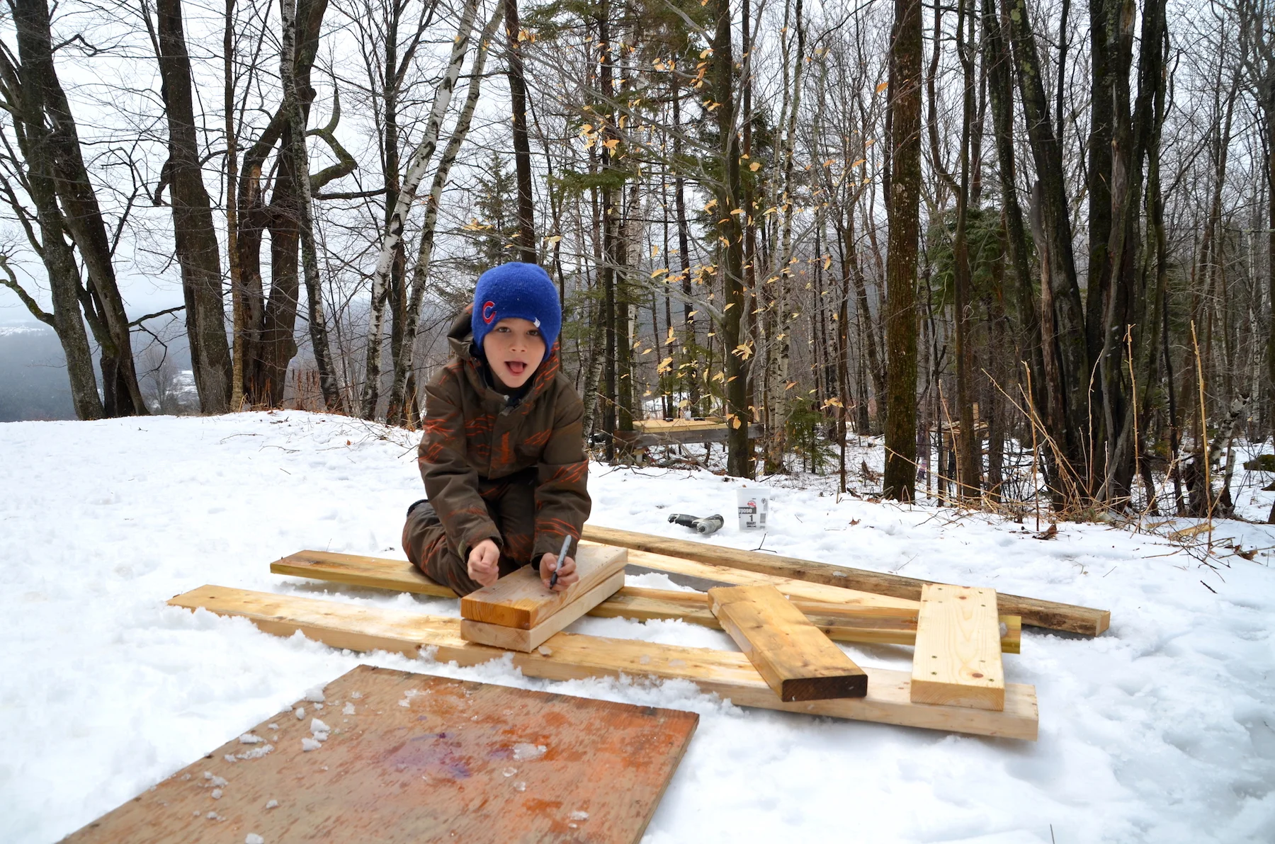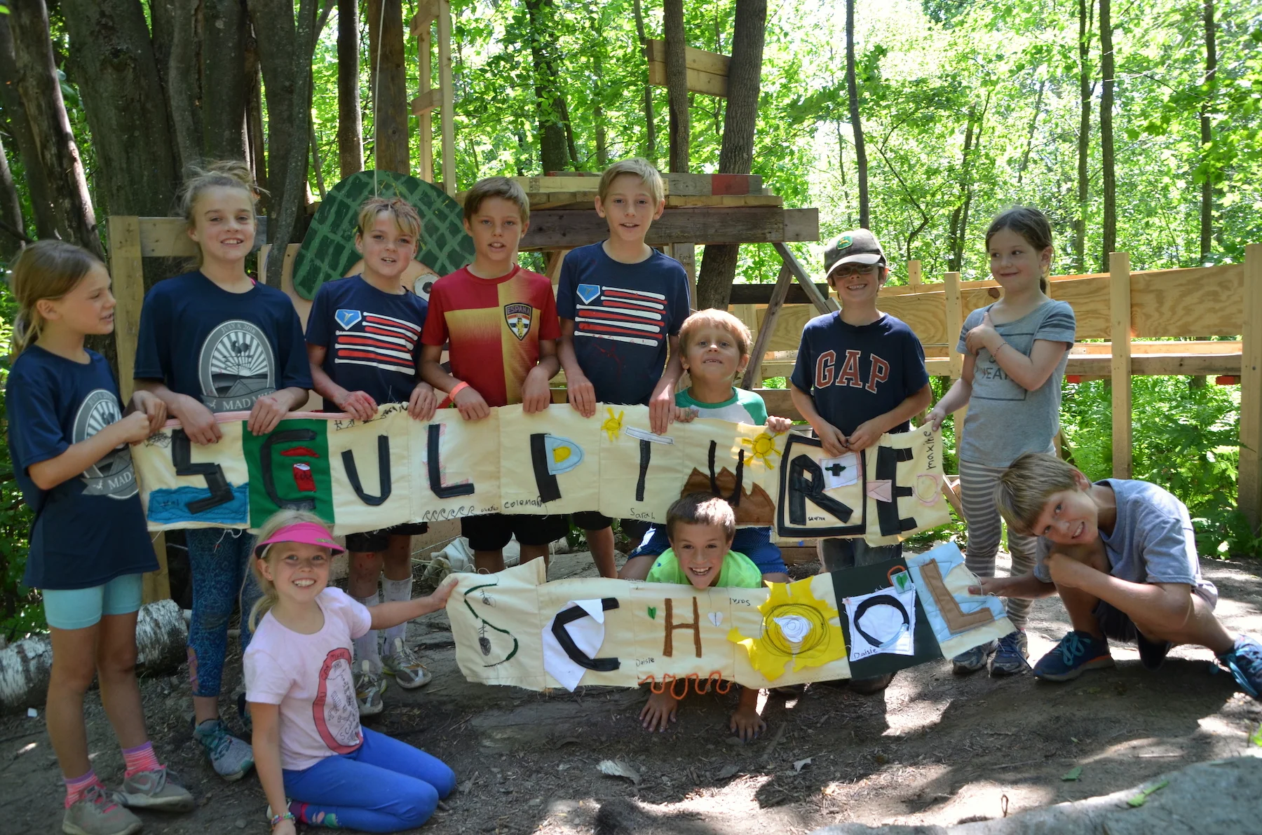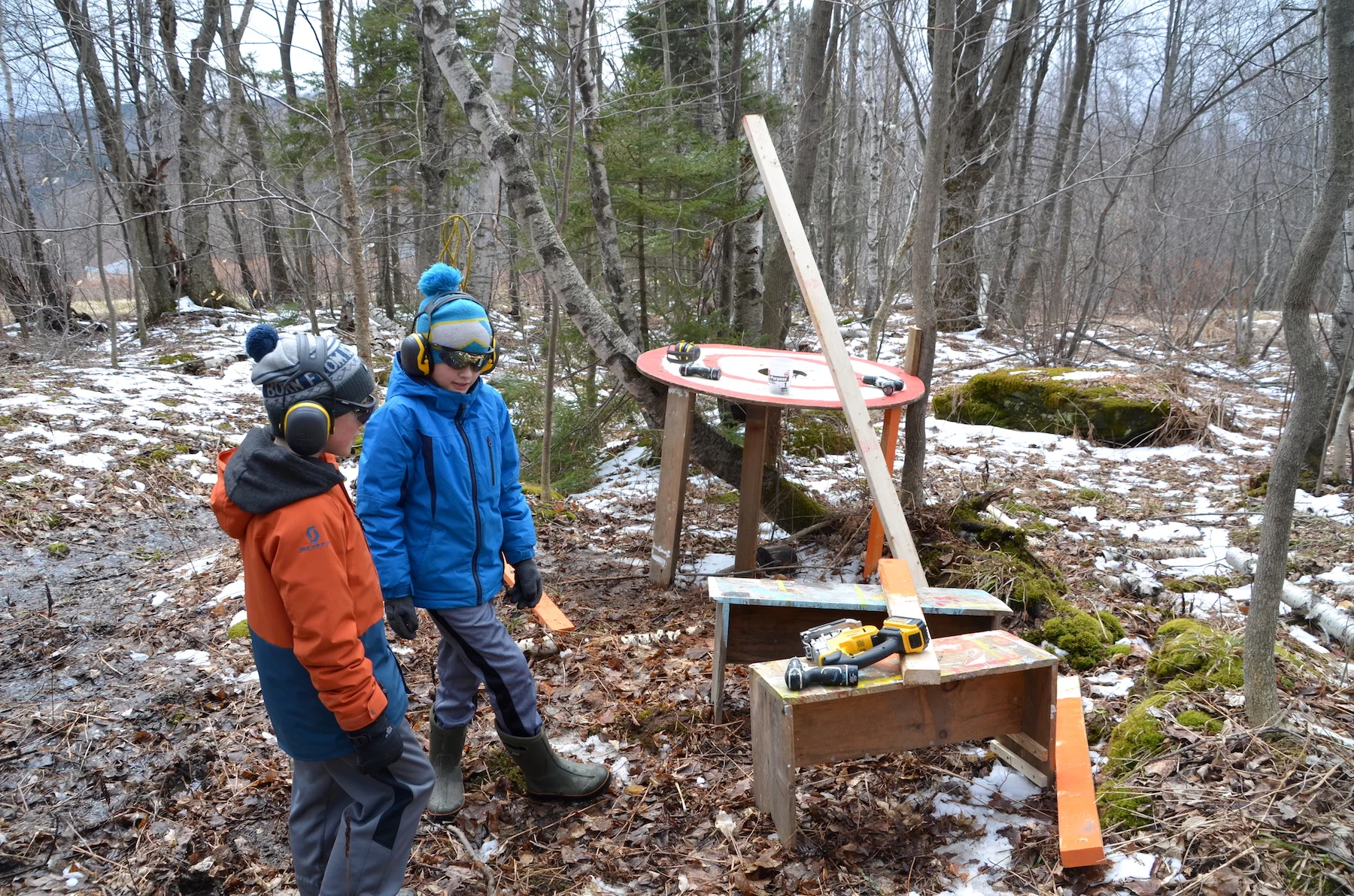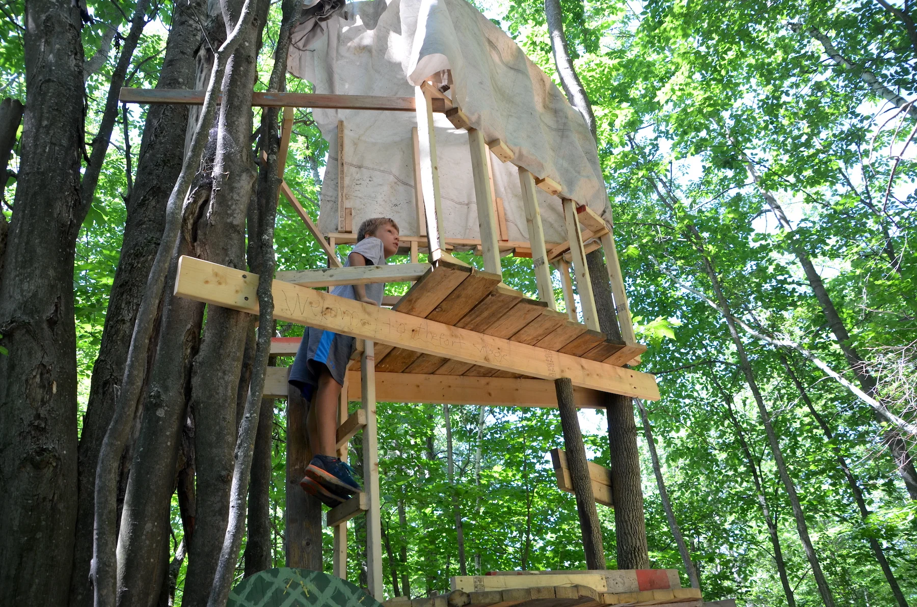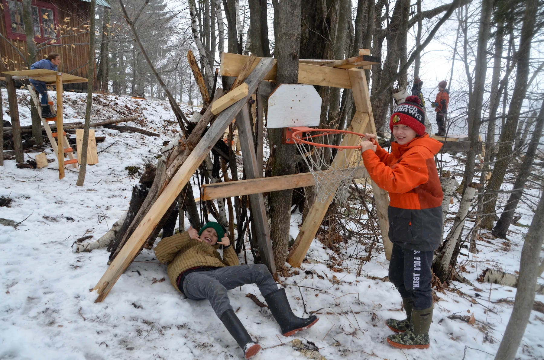 The Sculpture School take on the adventure playground concept is set within the woods surrounding our shop at Knoll Farm in Fayston, VT. Kids have access to drills, screws, clamps, scrap wood, and jigsaws. They use these tools and materials to construct in a natural landscape, adding on, taking down and evolving the village of forts through the seasons.