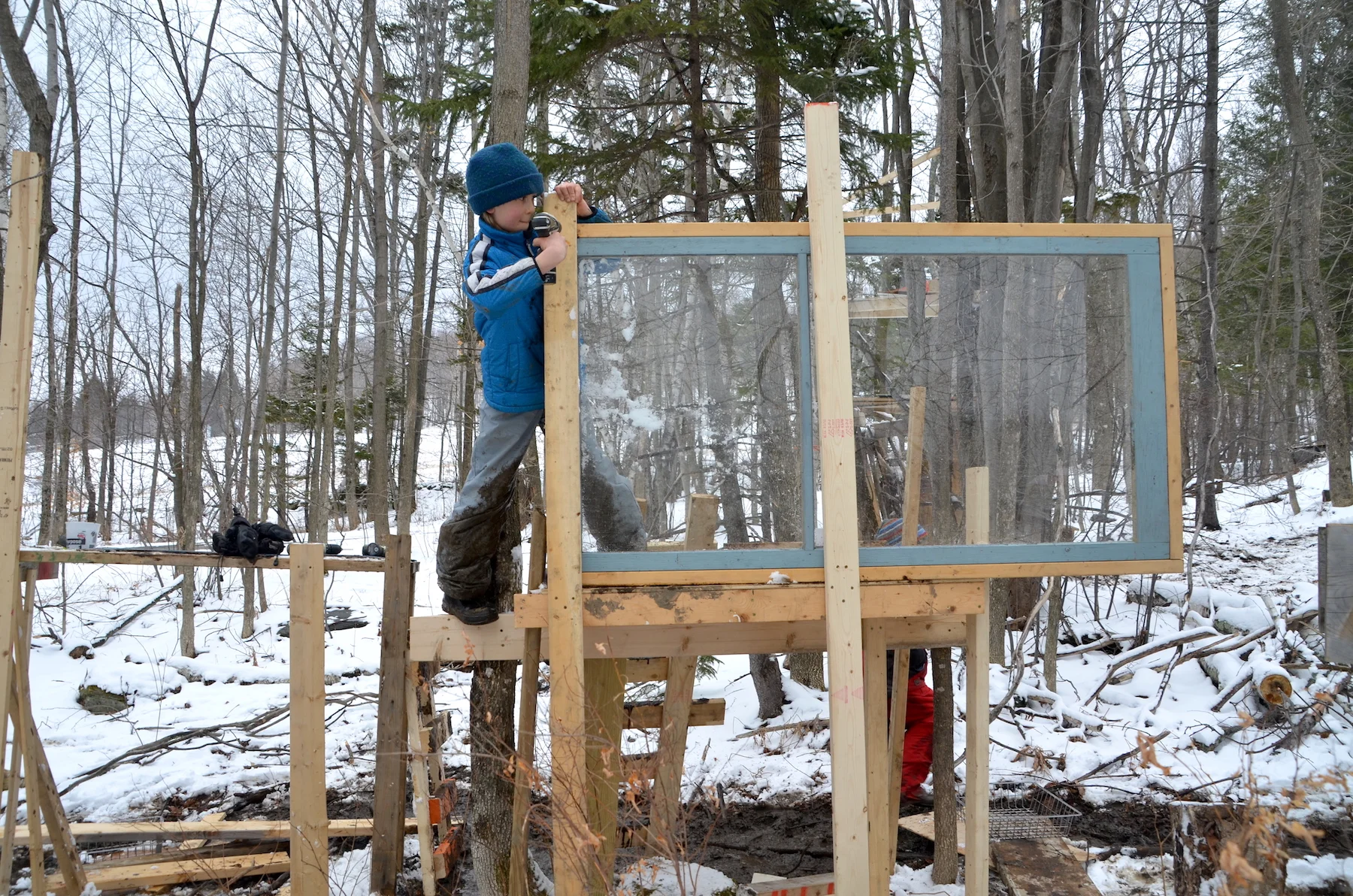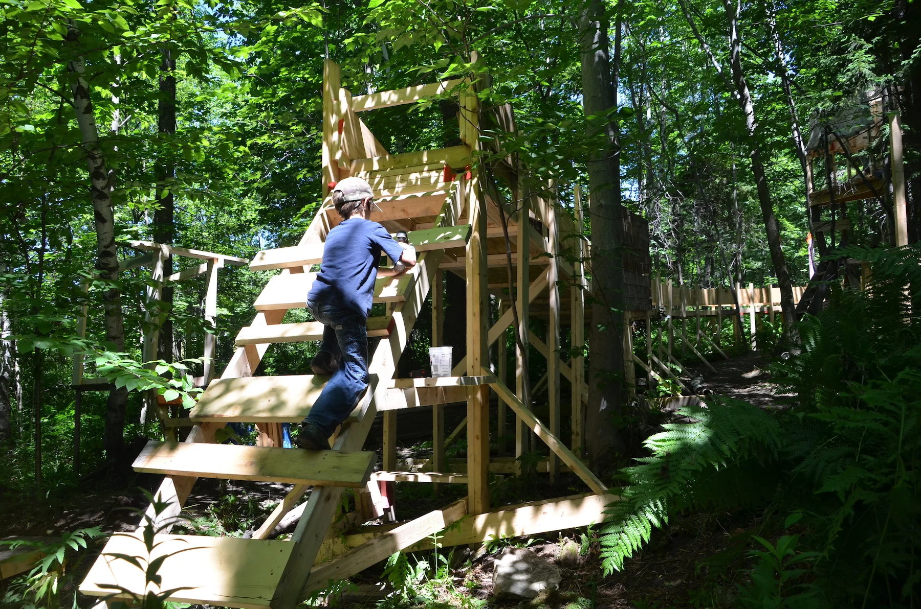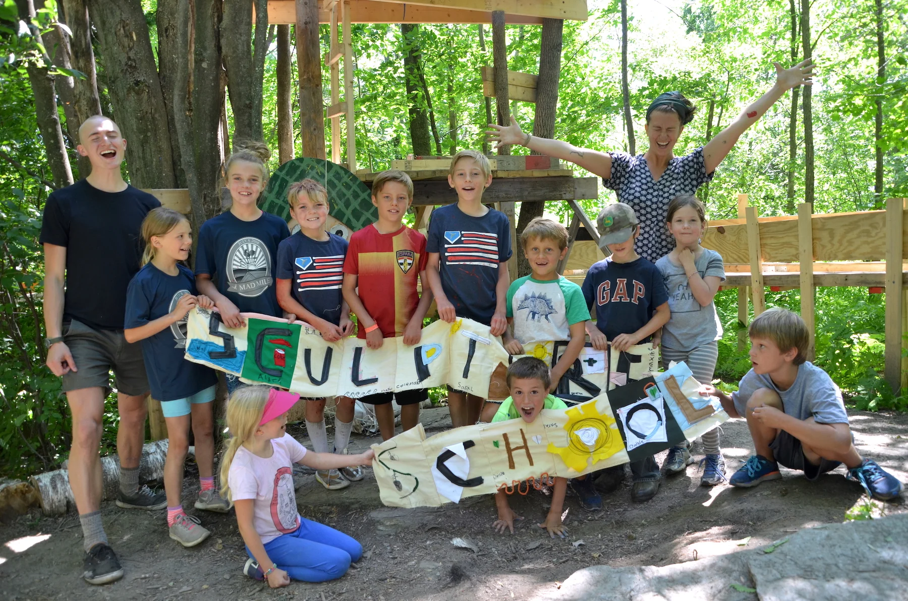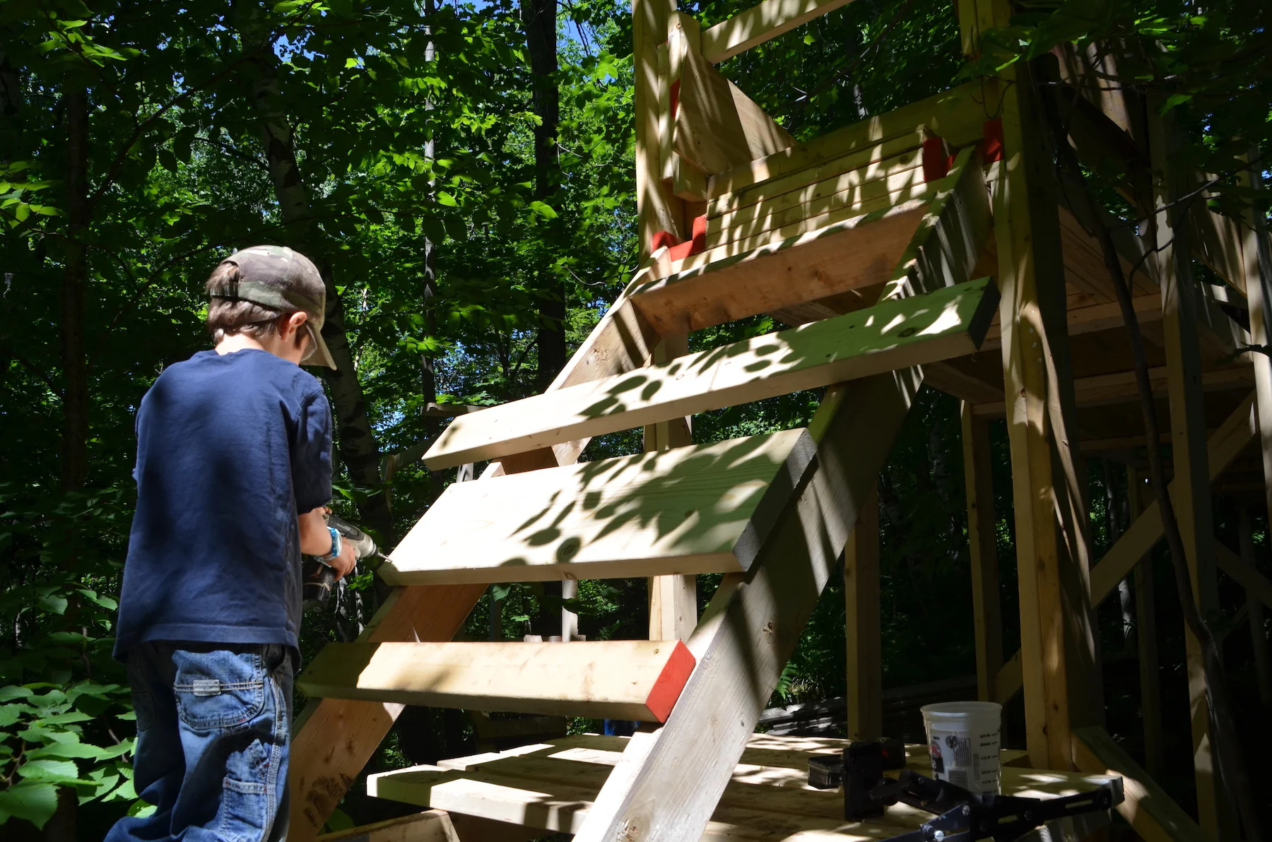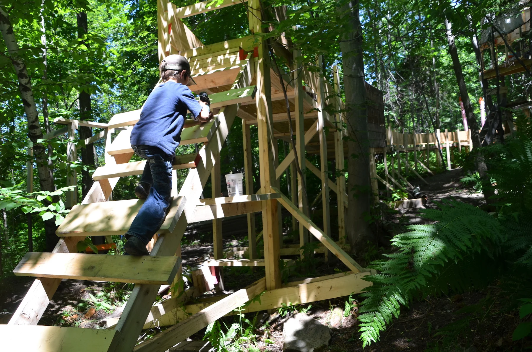 The Sculpture School take on the adventure playground concept is set within the woods surrounding our shop at Knoll Farm in Fayston, VT. Kids have access to drills, screws, clamps, scrap wood, and jigsaws. They use these tools and materials to construct in a natural landscape, adding on, taking down and evolving the village of forts through the seasons.