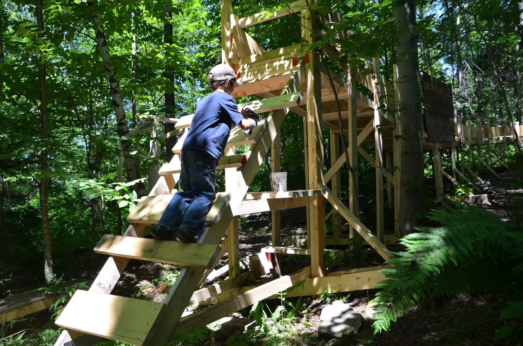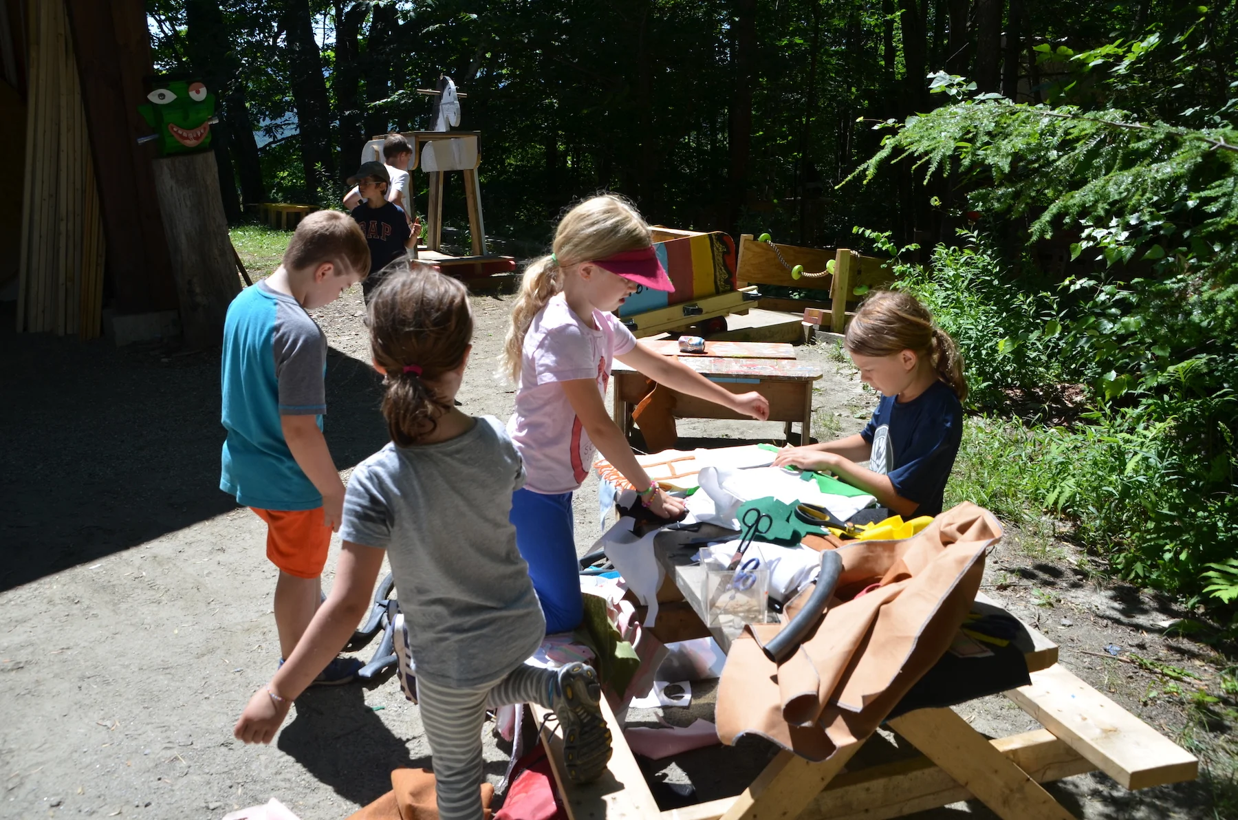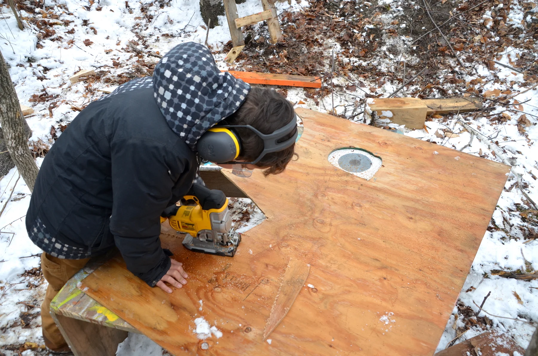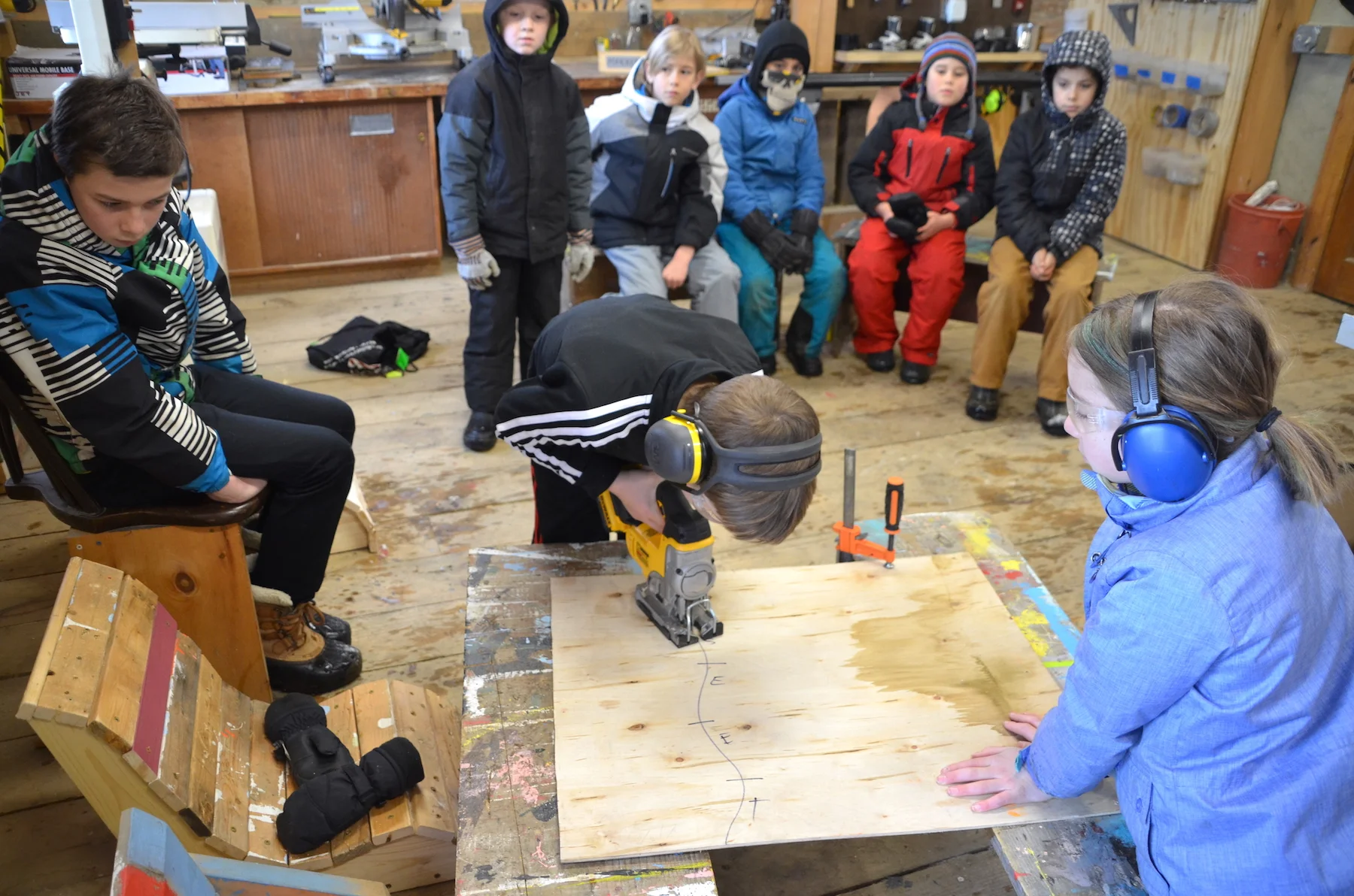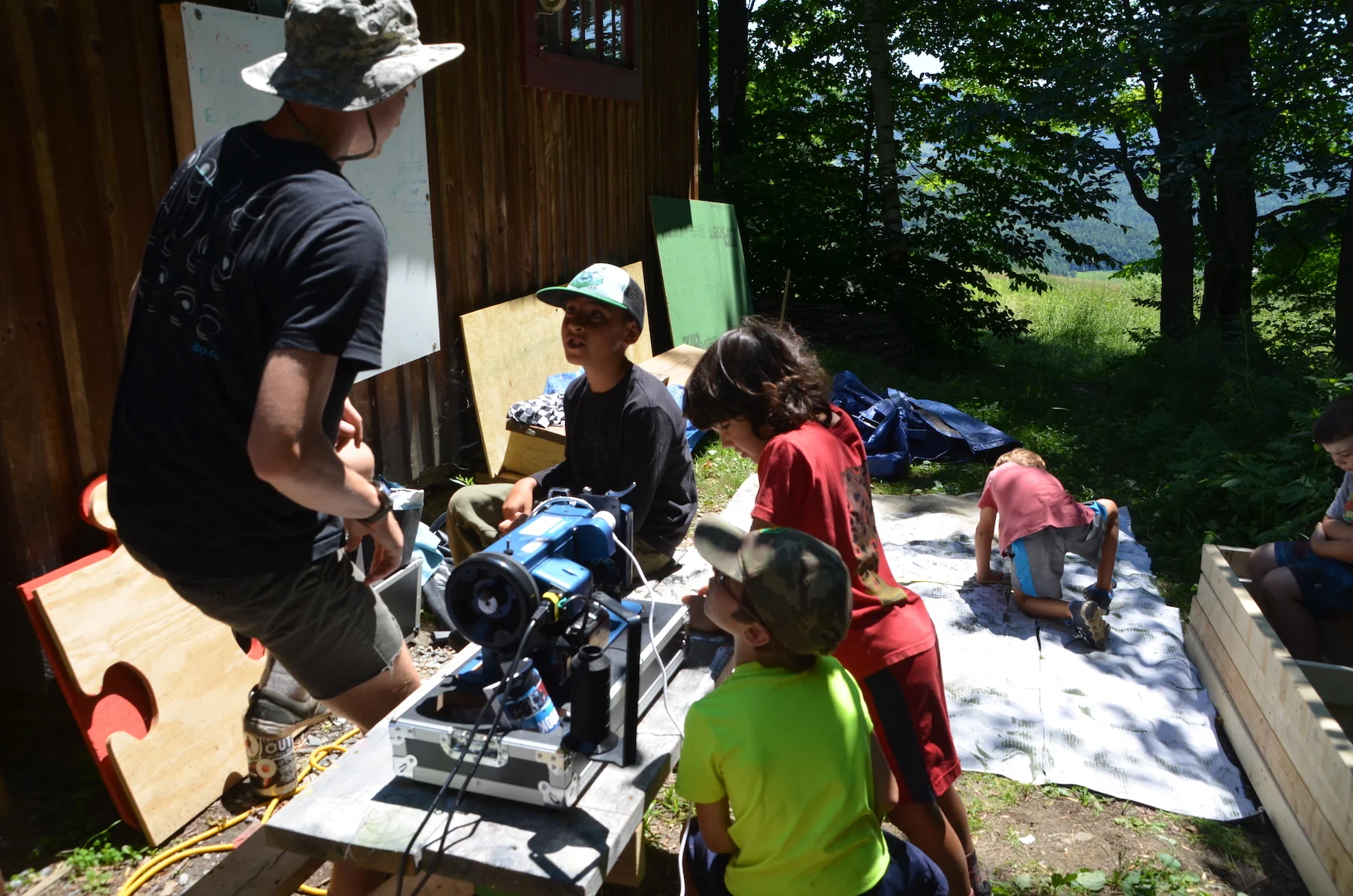 The Sculpture School take on the adventure playground concept is set within the woods surrounding our shop at Knoll Farm in Fayston, VT. Kids have access to drills, screws, clamps, scrap wood, and jigsaws. They use these tools and materials to construct in a natural landscape, adding on, taking down and evolving the village of forts through the seasons.