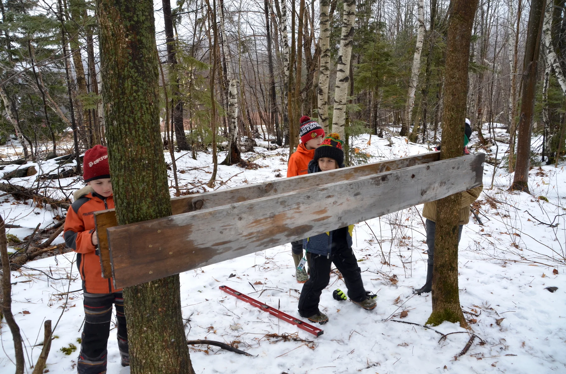 A group of 8 kids, ages 7-10, braved the snow to take part in the first fort building session in mid-April 2018. The cold and wet terrain didn’t stop kids from building, they eagerly worked for hours constructing ladders and platforms in the forest.