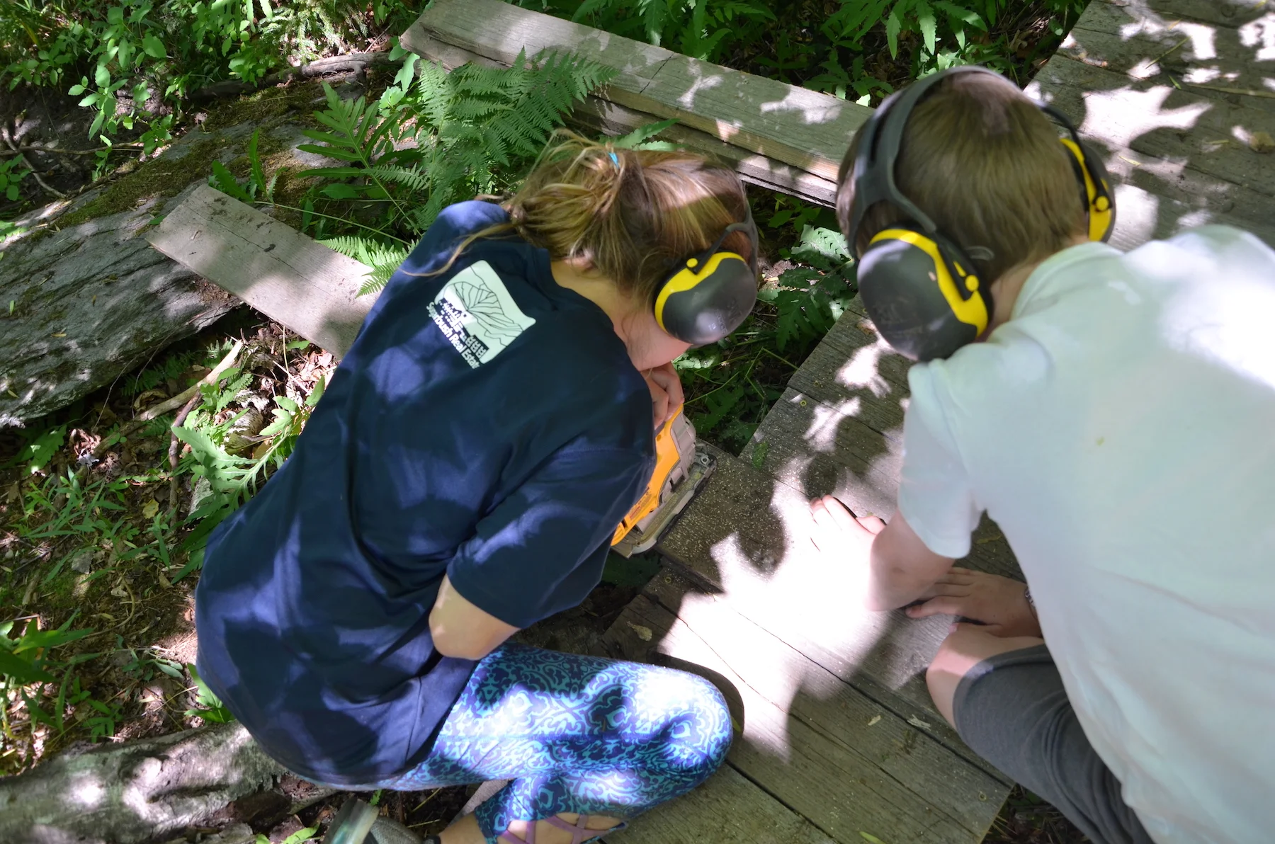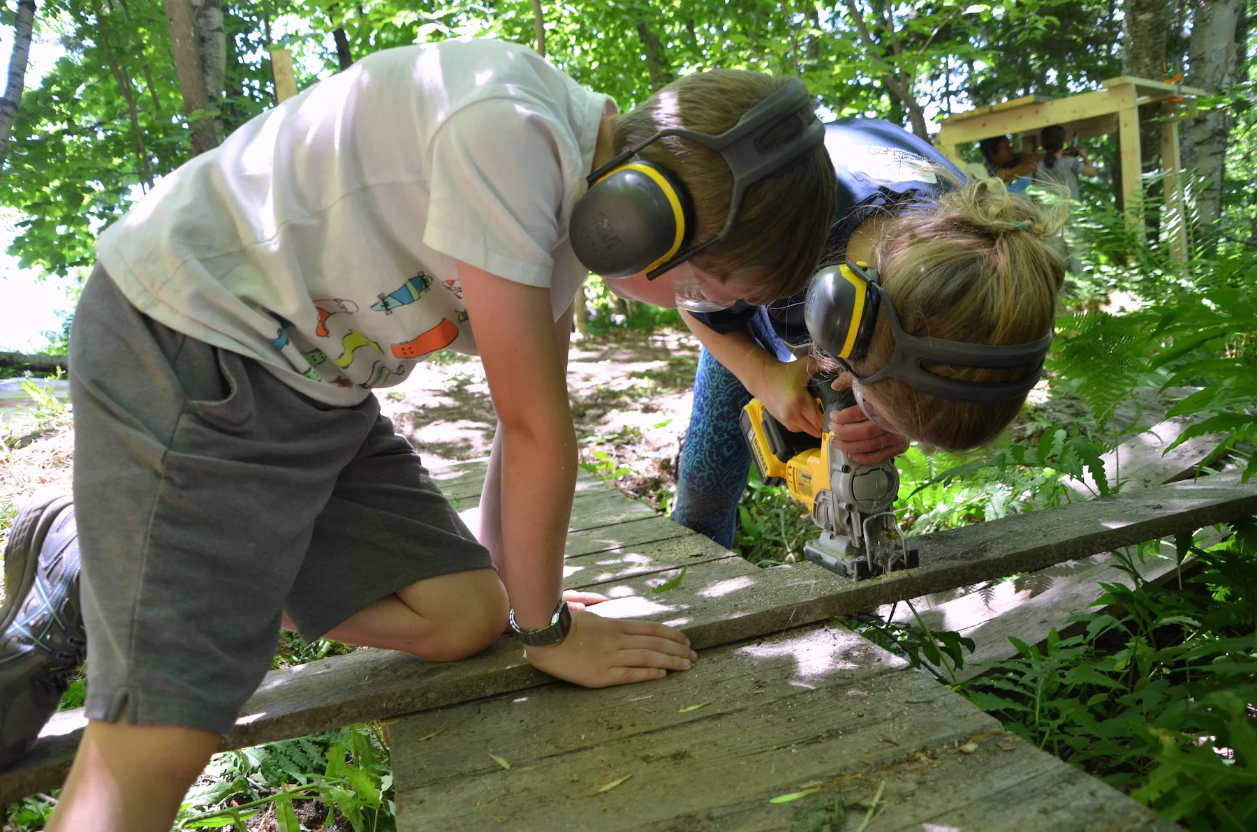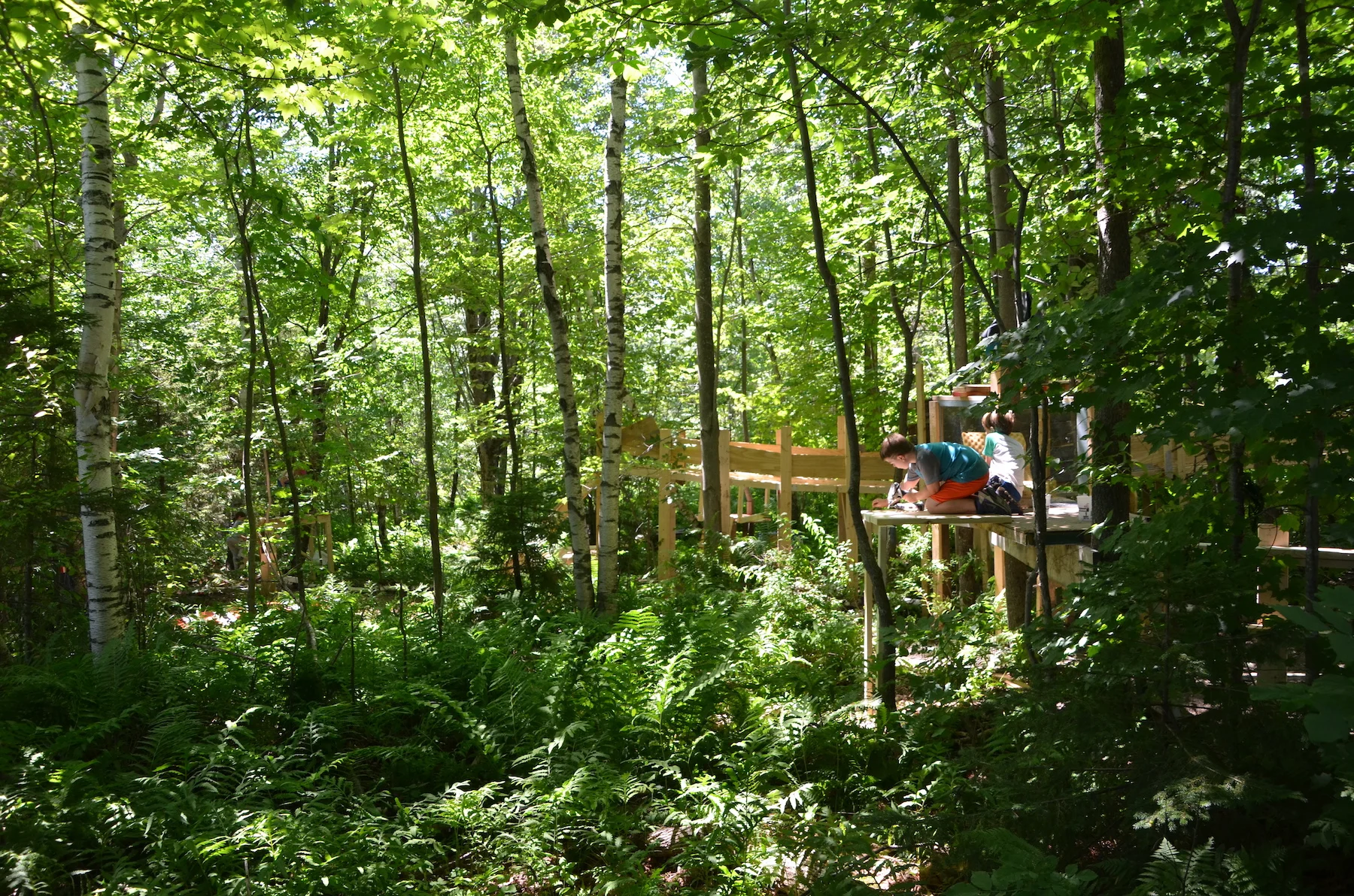 Fort building sessions offer kids the freedom to design structures in the forest. They sculpt with lumber and natural materials — turning stumps into benches, building bridges over streams, and clearing plants to create trails.