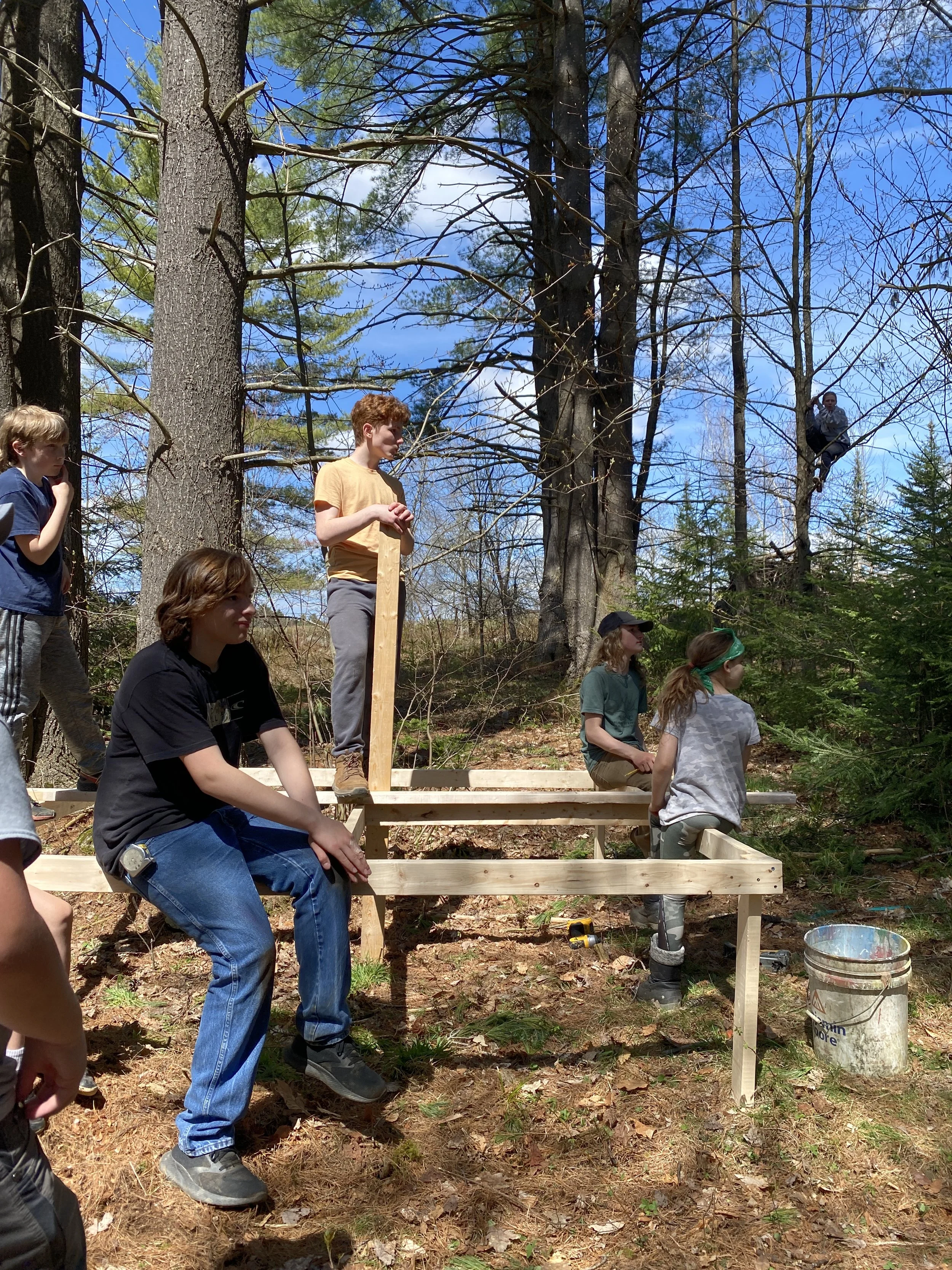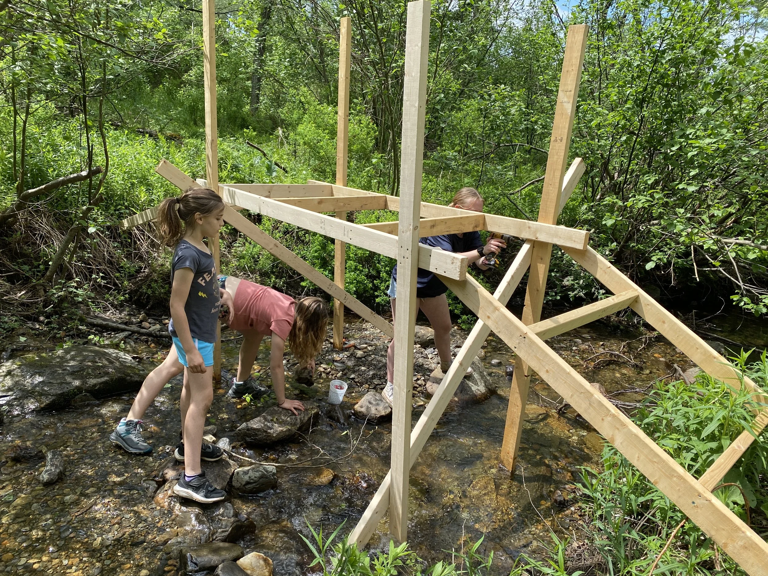 We are making a new place! Students (ages 10-14) have 7 acres of forest to explore and build their own interpretation of a shelter. Our days are full of trail making, landscaping, building, and dodgeball!