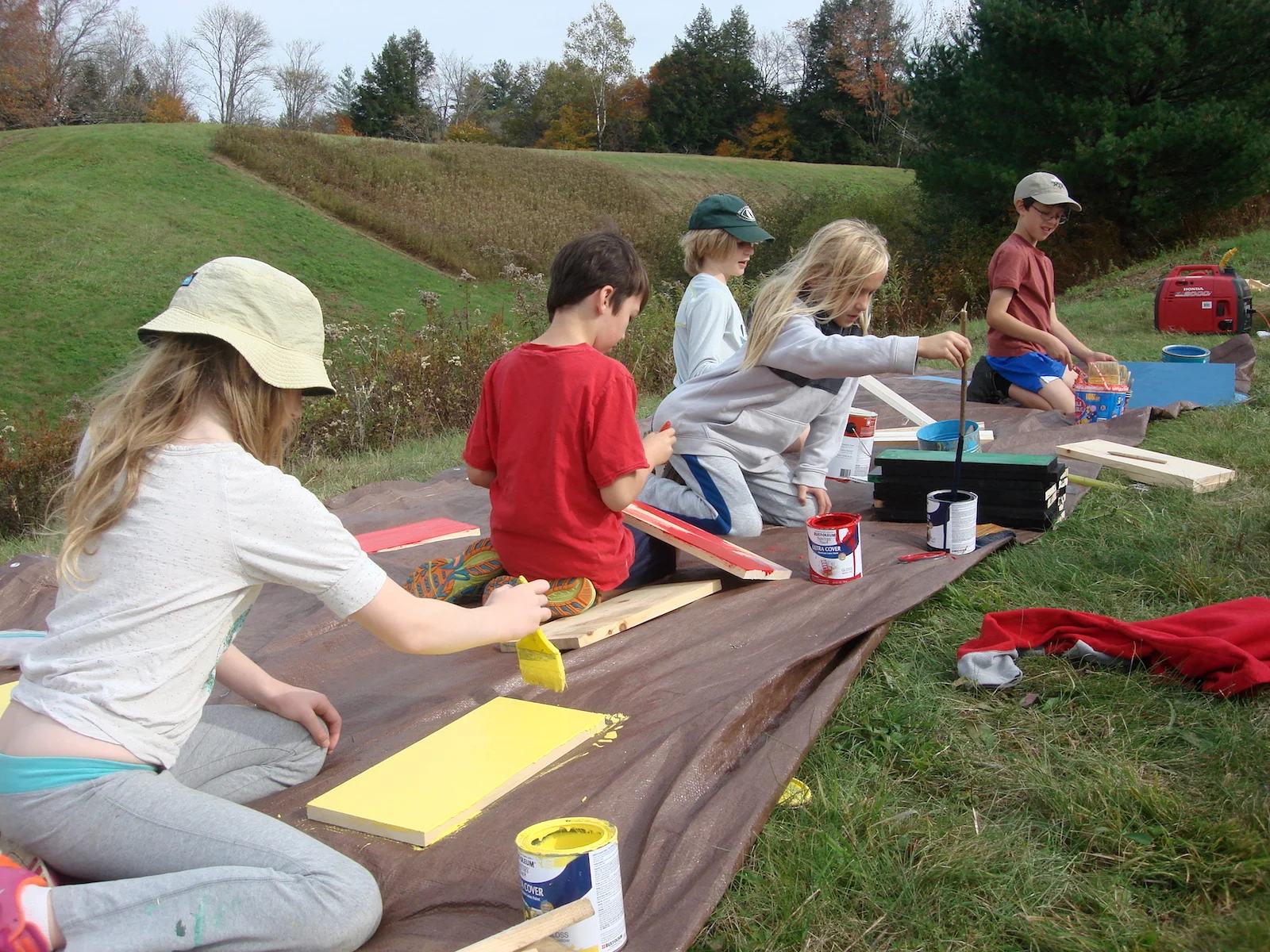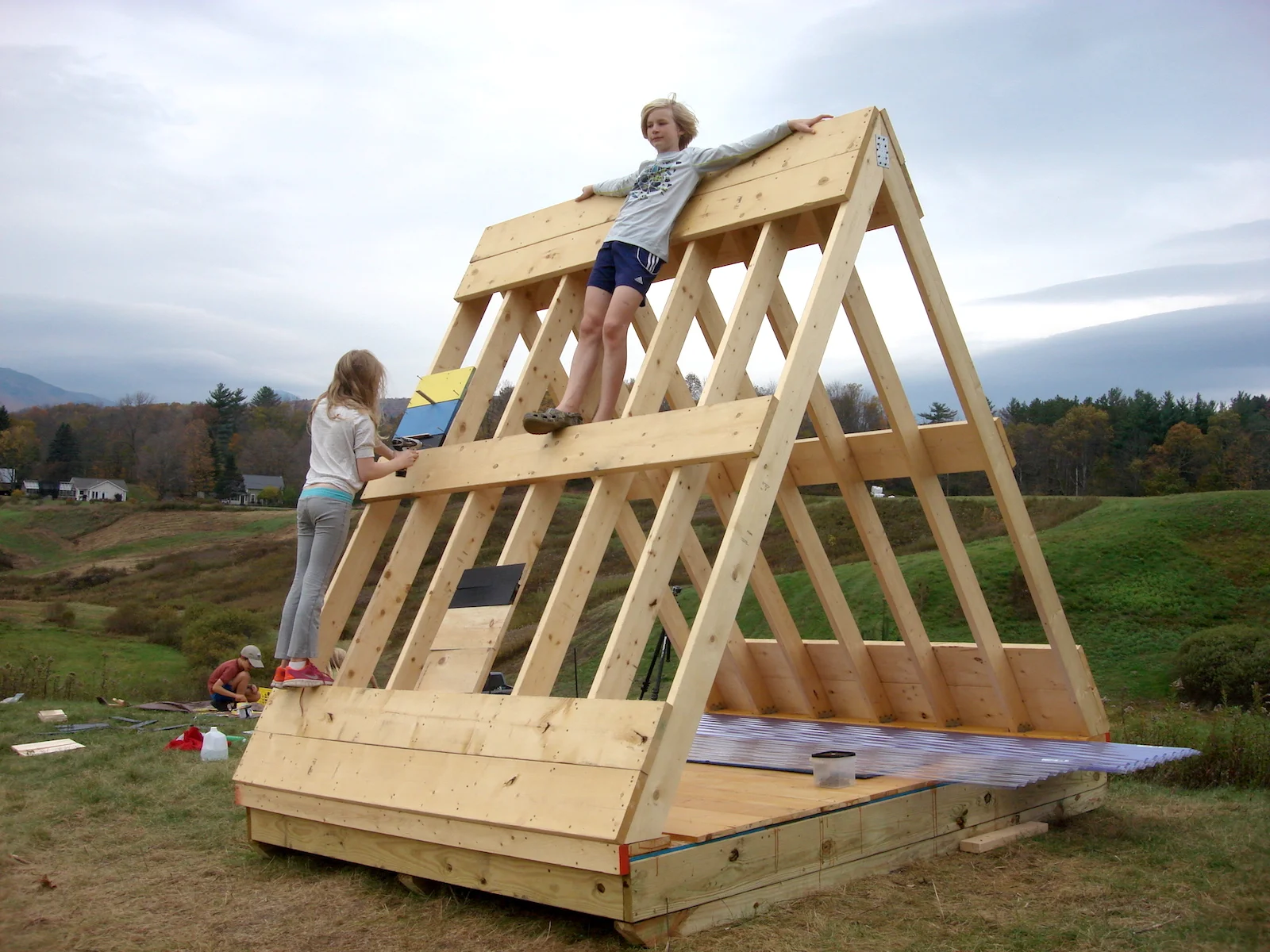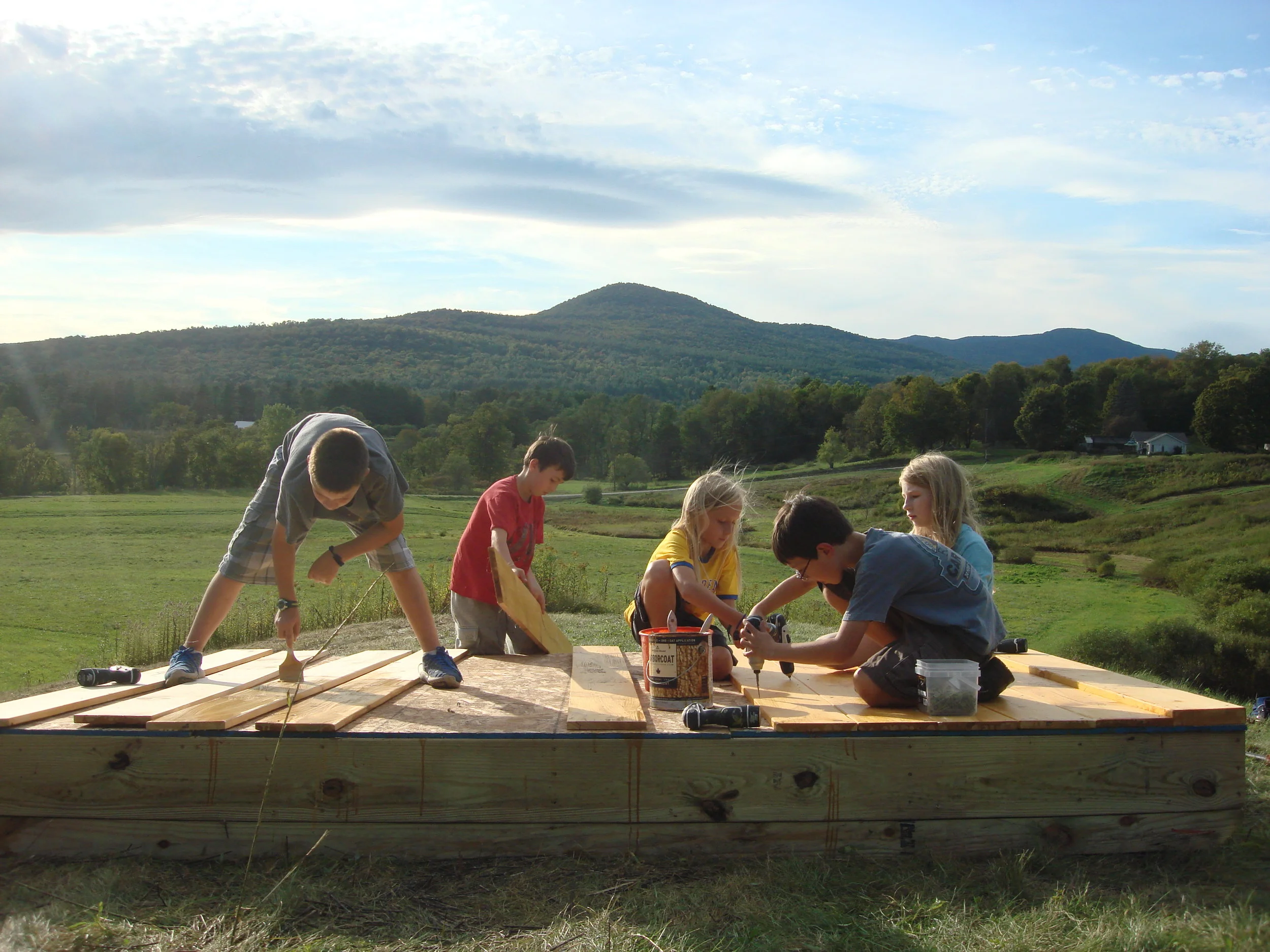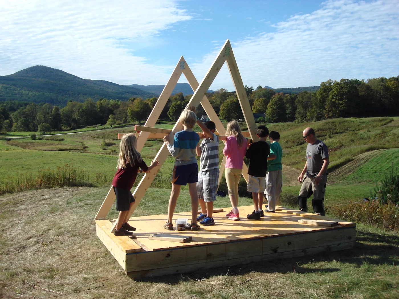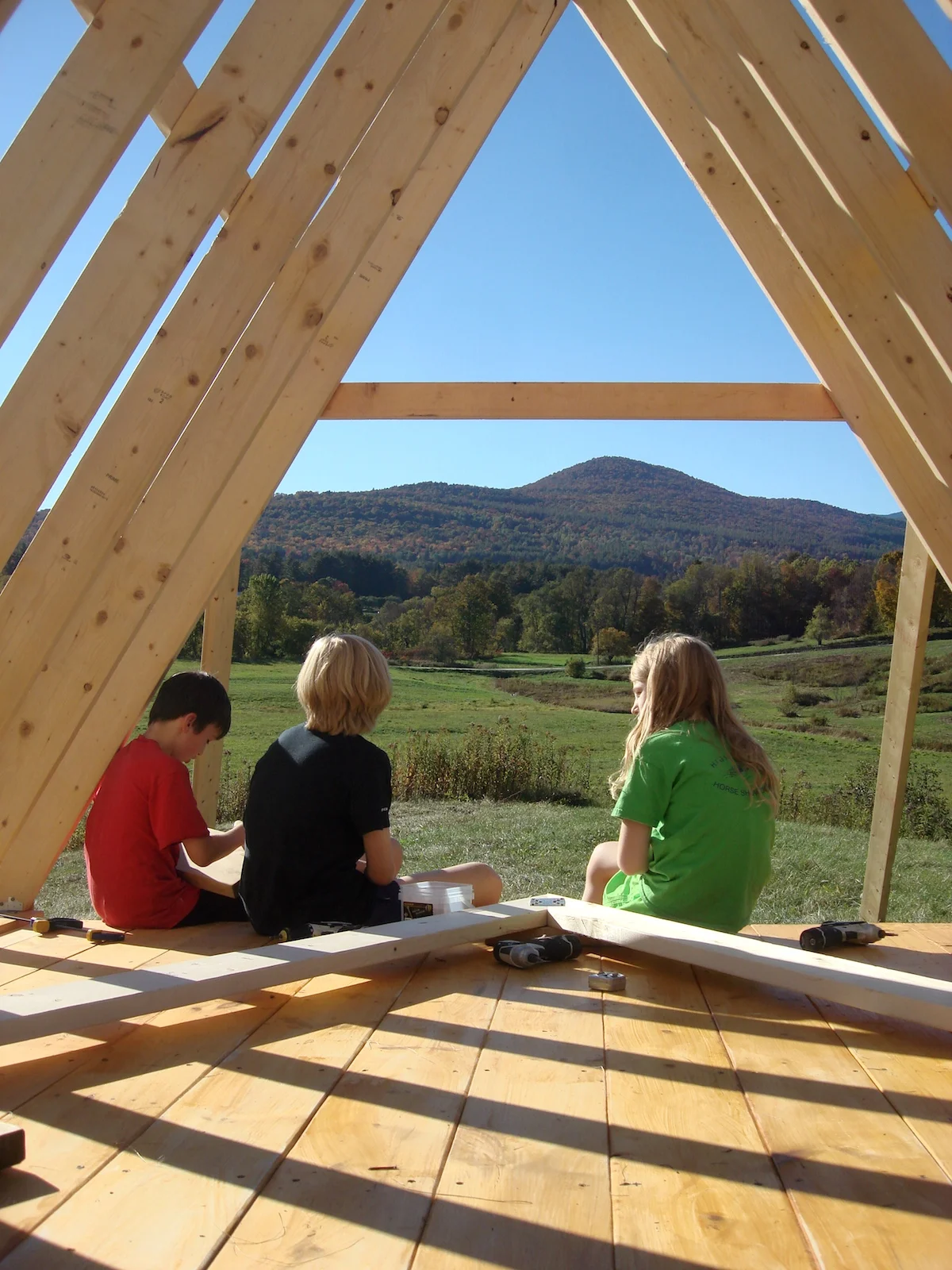 Over the course of 6 weeks, kids gathered after school to build a permanent structure at Pony Farm in Moretown, Vermont. The structure is an equilateral triangle on an 8' x 10' deck. Kids, ages 7-12, met one afternoon per week to build and learn about various aspects of the structure, including framing the deck, raising wall studs, and attaching polycarbonate roofing. The shelter will serve as a gathering space for future educational programs at Pony Farm. Read an article about the project at kidsvt.com.