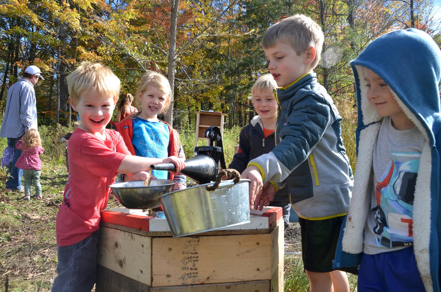 Jasper, Hannah and Mason started tinkering with the water pump. They attached the PVC pipe to the pump and experimented with a bucket of water. After toying with it for a few minutes they finally got it to work and started pumping water.